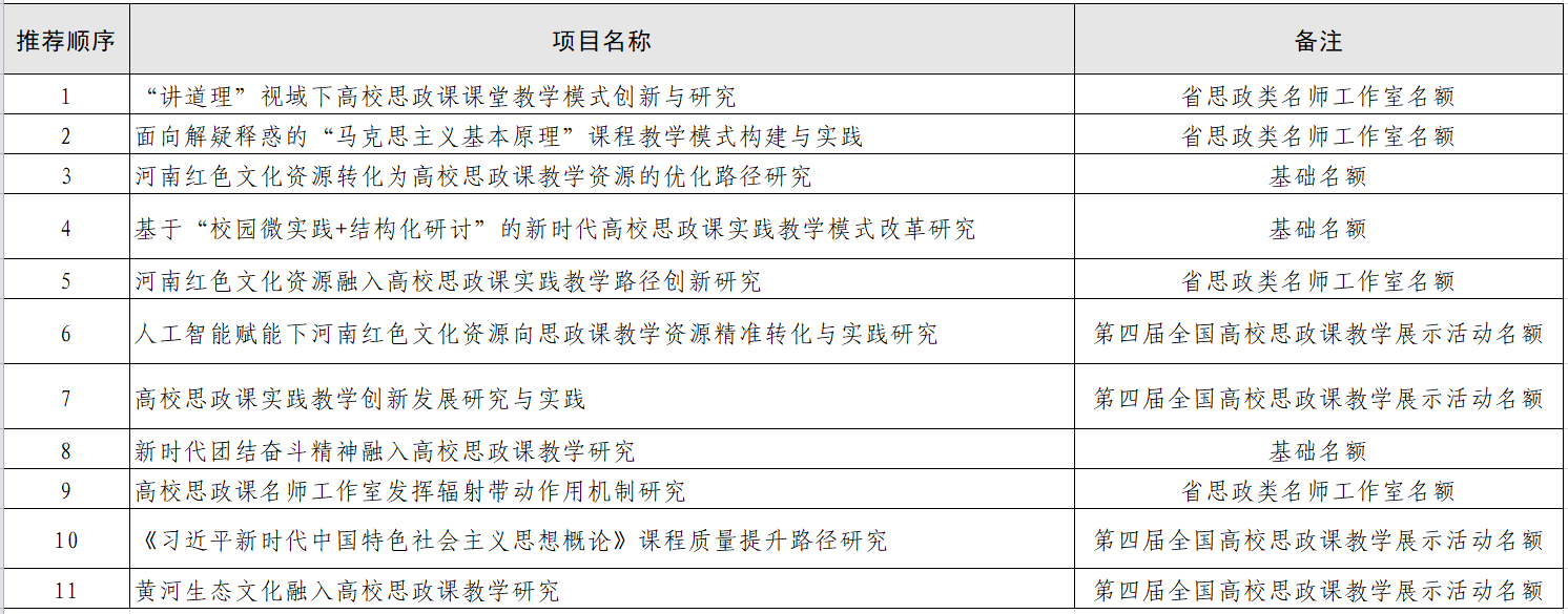 根据《关于开展2026年河南省高等教育教学改革研究与实践项目立项推荐工作的通知》文件精神,经课程组申报、专家组评审,拟推荐以下11项参评2026年河南省高等教育教学改革研究与实践项目(思政课类),现予以公示。